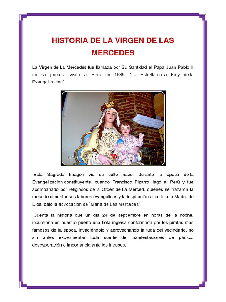 Historia de la virgen de las mercedes peru. Aquí la historia detrás de esta celebración tan especial para los piuranos. Desde hace 55 años esta fecha es considerada feriado no laborable para la región piura. La devoción a nuestra señora de las mercedes en el perú se remonta a los tiempos de la fundación de lima. Esta imagen en sus inicios se salvó de ser destruida hasta en dos ocasiones por los piratas que arribaron al puerto peruano.