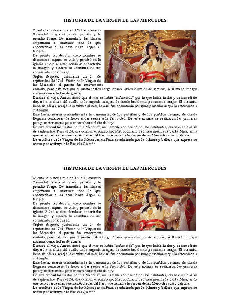 Historia de la virgen de las mercedes. La devoción a la virgen de las mercedes también llamada estrella de la fe y de la evangelización por san juan pablo ii en su visita al perú de 1985 se remonta al s. La historia de la virgen de las mercedes es una gran historia y es importante entenderla para lograr entender por qué es alaba en diferentes circunstancias según lo que sucedió un 1 de agosto del año 1218 el fundador de su nombre pedro nolasco llamado santo años después por la iglesia católica se le presento la virgen de las mercedes ella se. Xvi con la llegada.